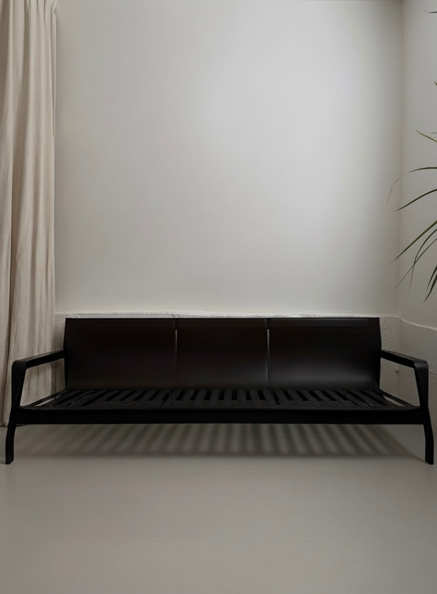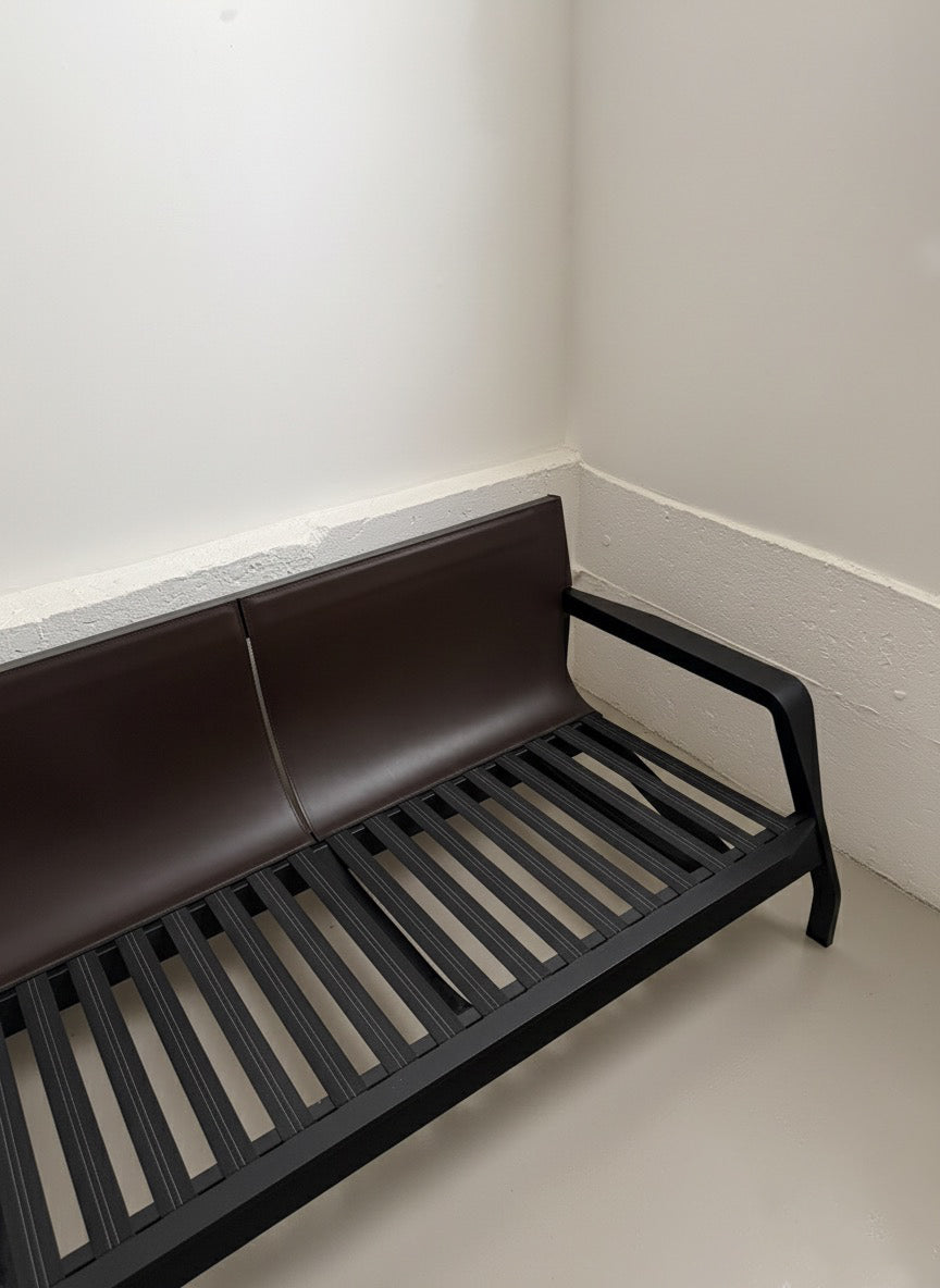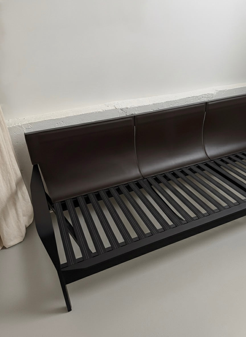 Coussins en cuir souple haut de gamme remplis de duvet avec cadre recouvert de cuir noir et coutures contrastées blanches.