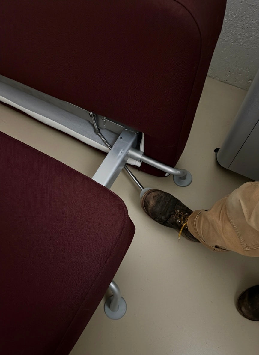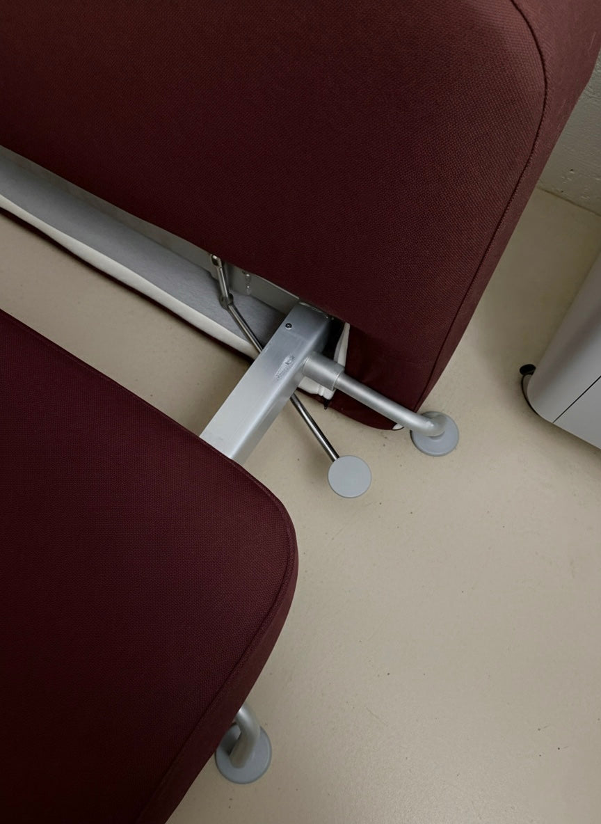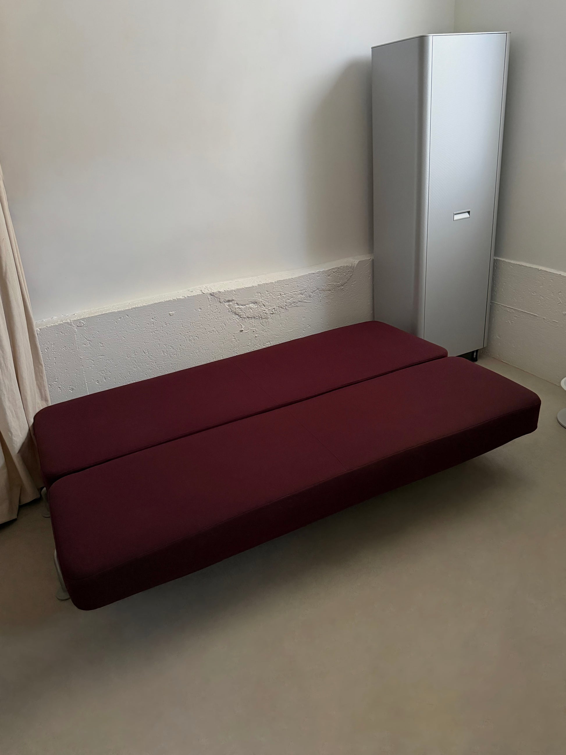 Lunar has a metallic grey varnished metal frame. The seat and backrest are each composed of a single padded polyurethane element with an upholstery covering that can be fully removed for cleaning. A simple mechanism is used to effortlessly lower the backrest to obtain a bed where two can sleep very comfortably.