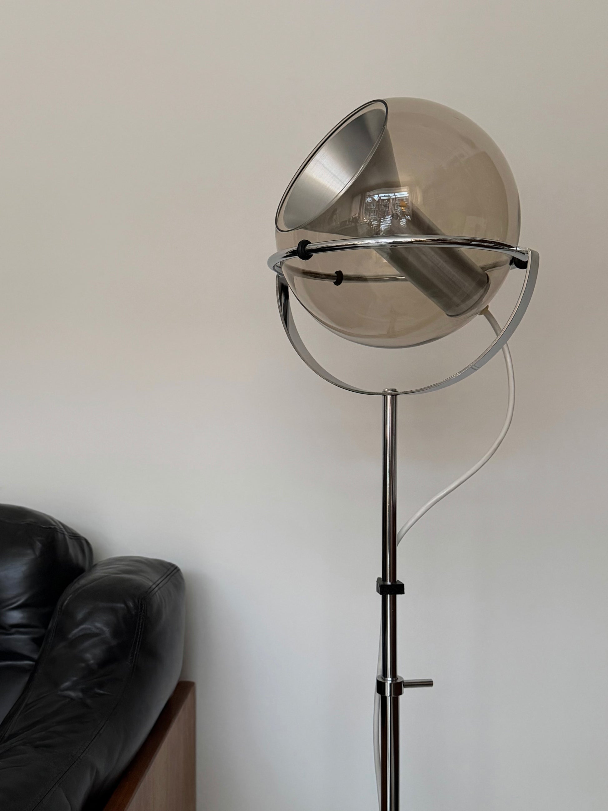 D-200 Globe floor lamp by Frank Ligtelijn for Raak Lichtarchitectuur. Floating smoke glass globe can be positioned freely, the height is also ajustable thanks to a simple mechanism in the middle of the stem. Meticulously restored to almost new condition. Made in the Netherlands, 1960’s.