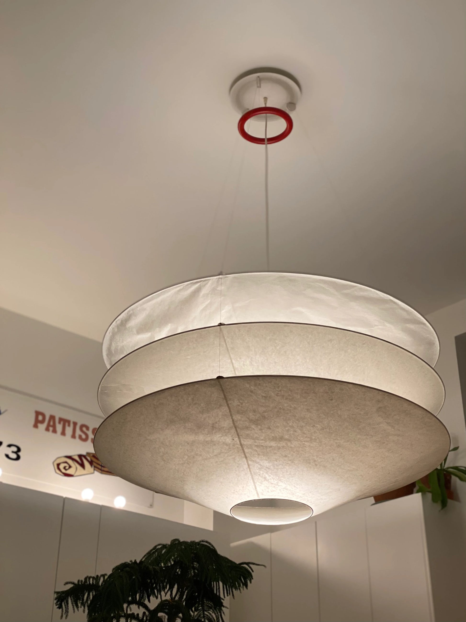 Designed by Ingo Maurer in 1980, Floatation is the layering of three Japanese paper shades, suspended by thin cables that can be controlled by manipulating the red ring that hangs above. A total of 5 bulbs illuminate the shades in different ways.