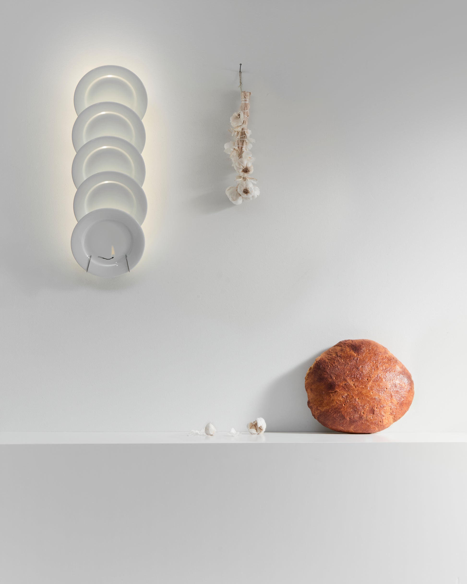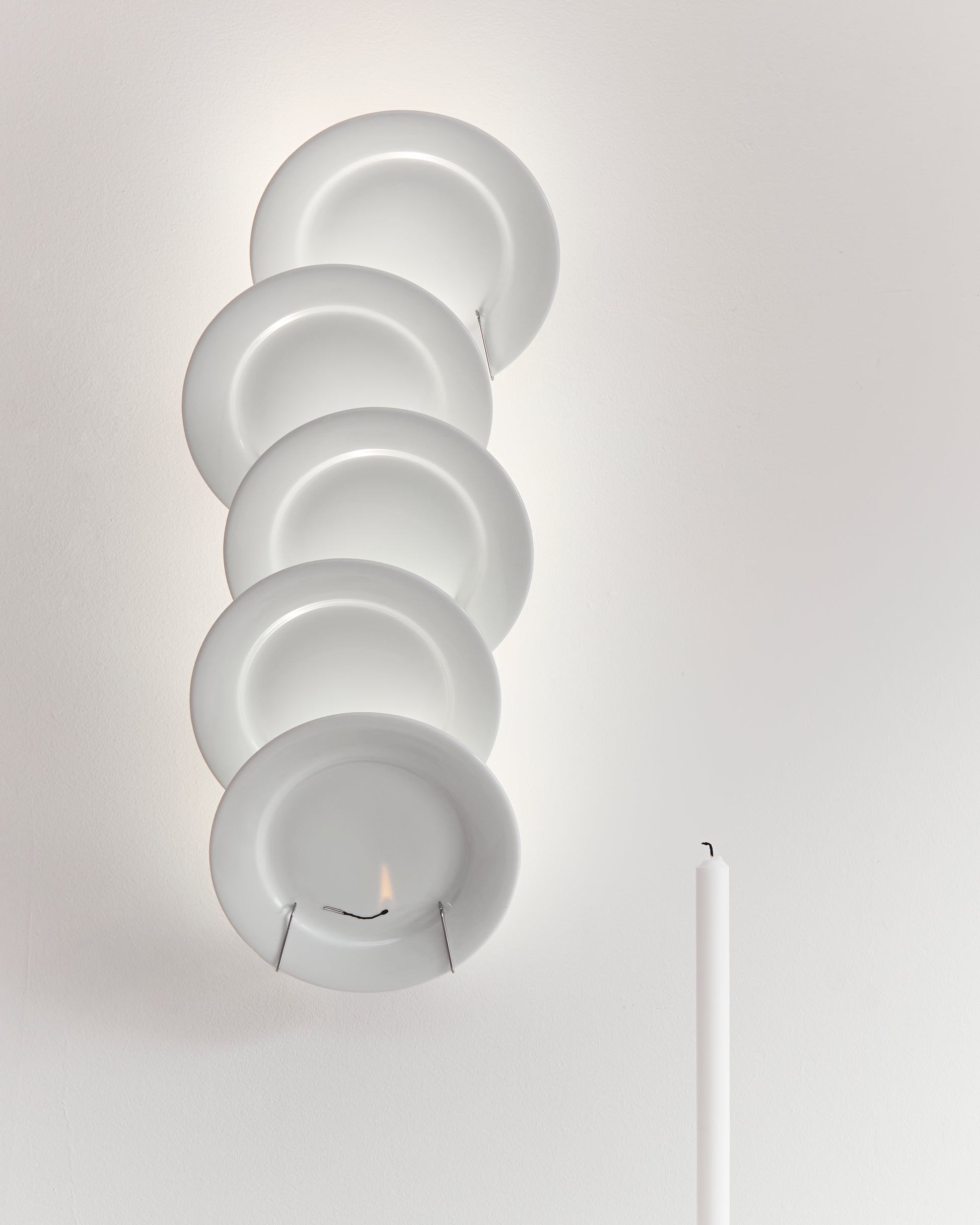 Designed by in house in 2025, Jasna Kuchnia transforms a simple plate holder into a fascinating light object. The wall lamp consists of five white porcelain plates arranged on top of each other. A narrow LED line, mounted behind the plates, gently illuminates the porcelain. The light refracts in the material and is reflected in finely graded brightness levels. A dynamic interplay of light and shadow is created. Thanks to its flexible design options, Jasna Kuchnia can be individually adjusted. The plates are movable on the sides, allowing the arrangement to be either vertical or slightly offset. Those who wish for a larger installation can easily expand the lamp with an additional element to create a series of ten or more plates. The design team has also come up with another clever optical effect: A small, dark matchstick is depicted on the front plate. When turned on, the light seems to ignite it – a subtle illusion that emphasizes the playful character of the design.