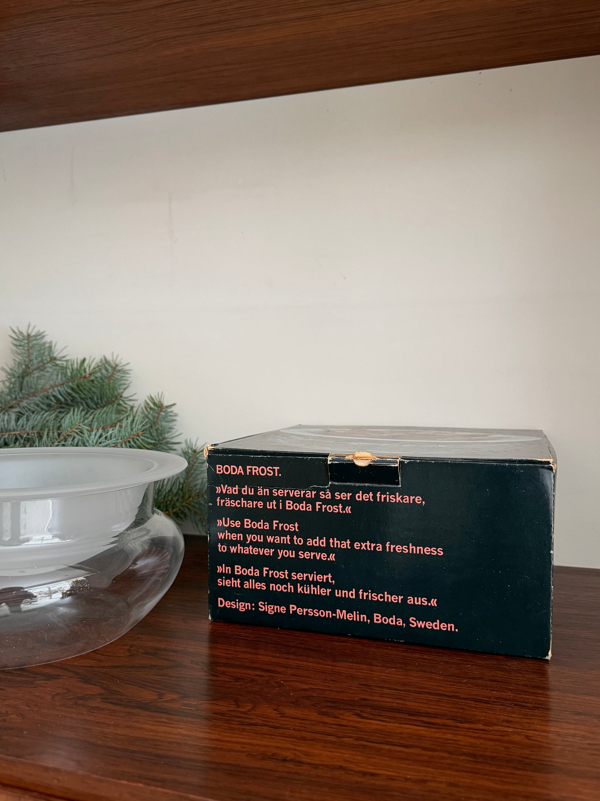 In good condition, the clear bowl has one very small chip. Original box included. Made in Sweden, 1960's.