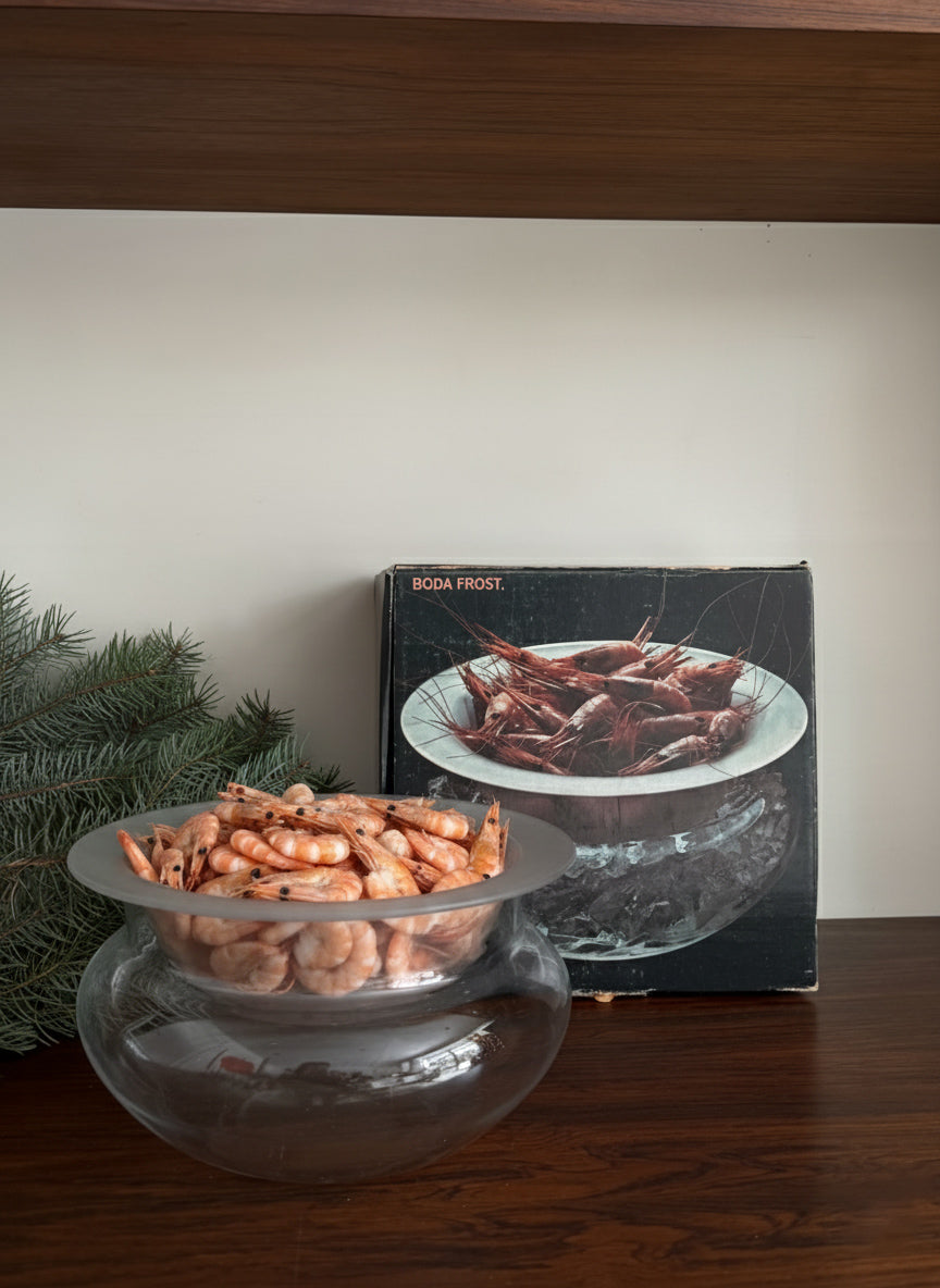 Large glass chiller dish by Boda. Made up of a clear bowl meant to be filled with crushed ice, with a frosted bowl that nestles perfectly over it, keeping the contents cold. Perfect for shrimp or a dip.