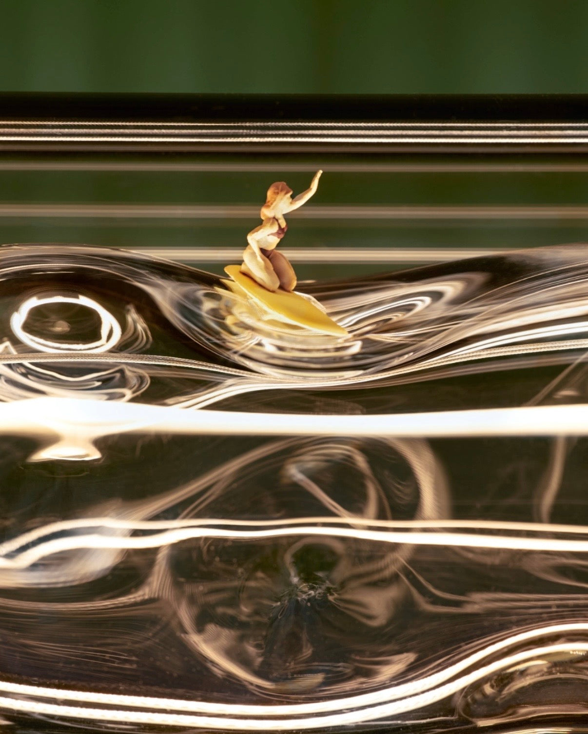 Designed by Sebastian Hepting in 2025, Nalum captures the dynamic motion of waves and the light reflection on the water's surface in an extraordinary light object. Its centerpiece is a floating, wave-shaped glass tube, which creates fascinating light lines through multiple reflections.