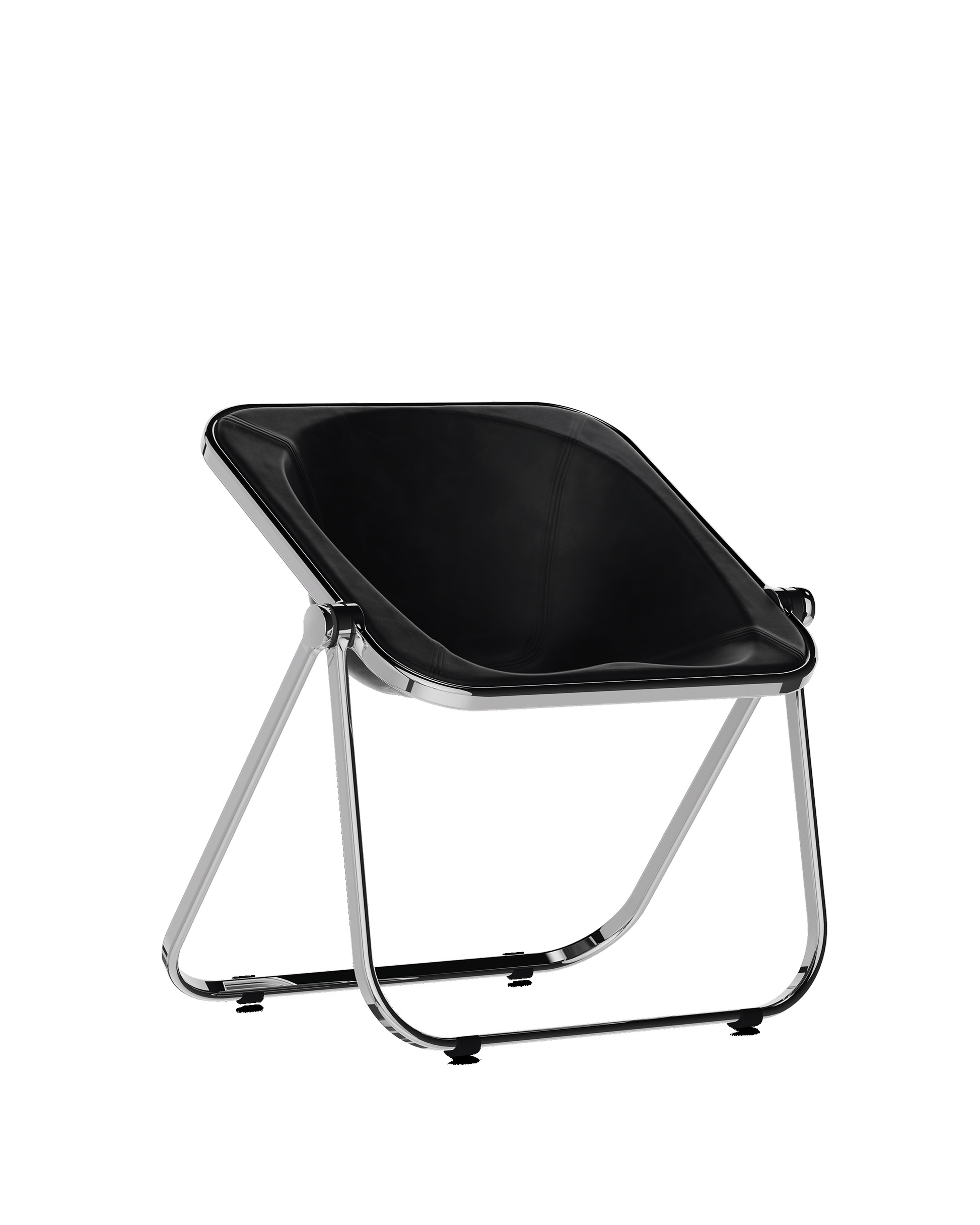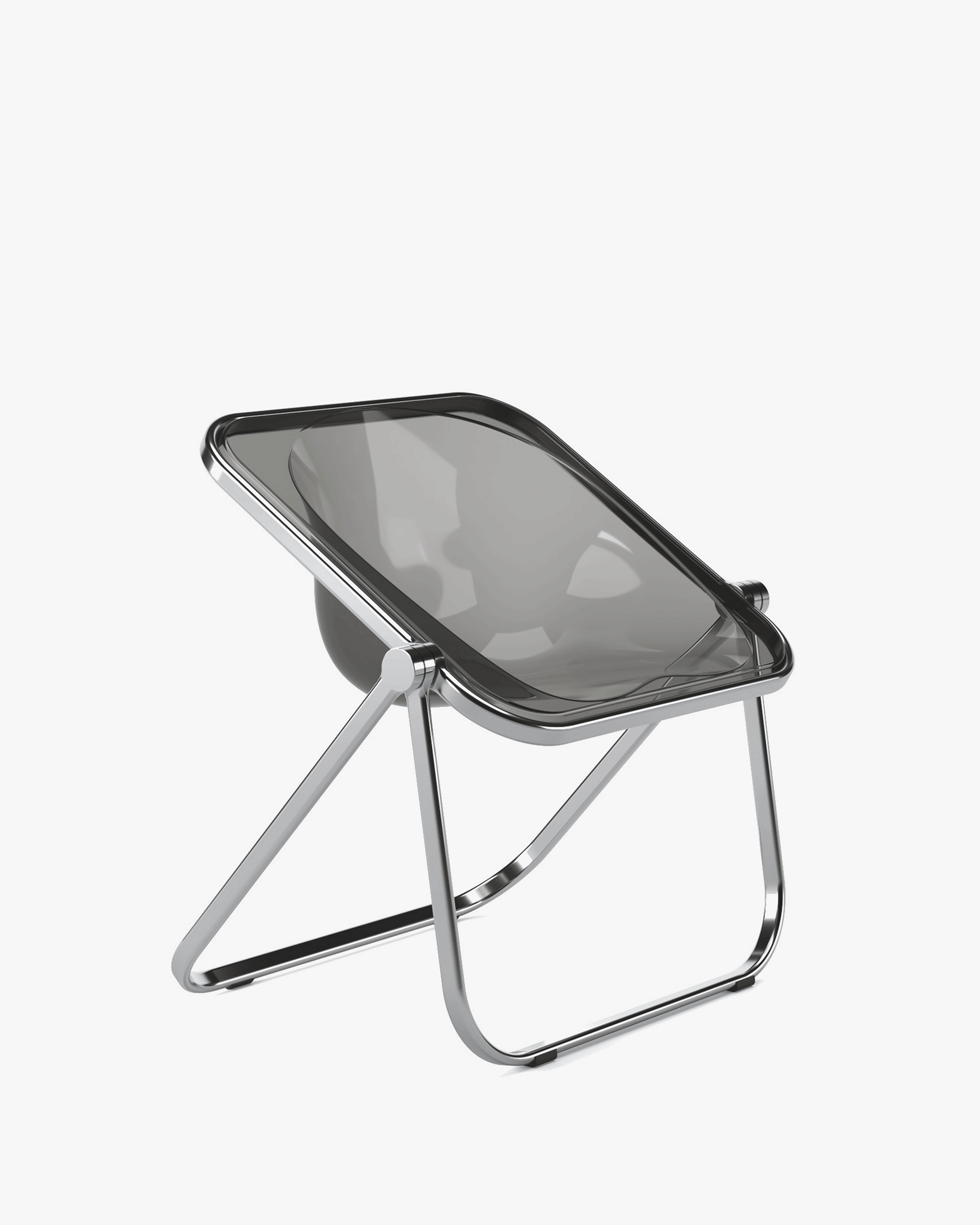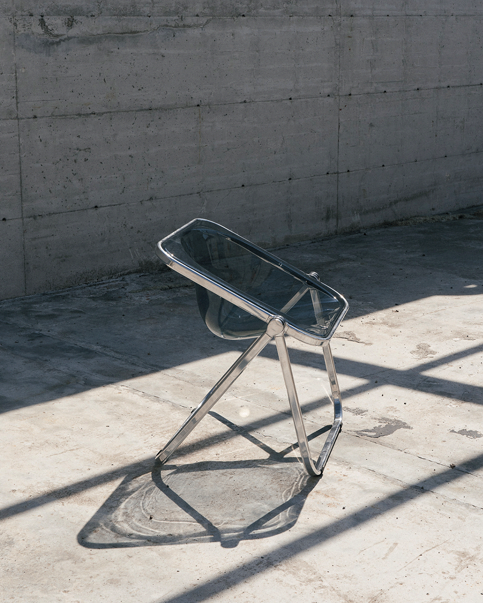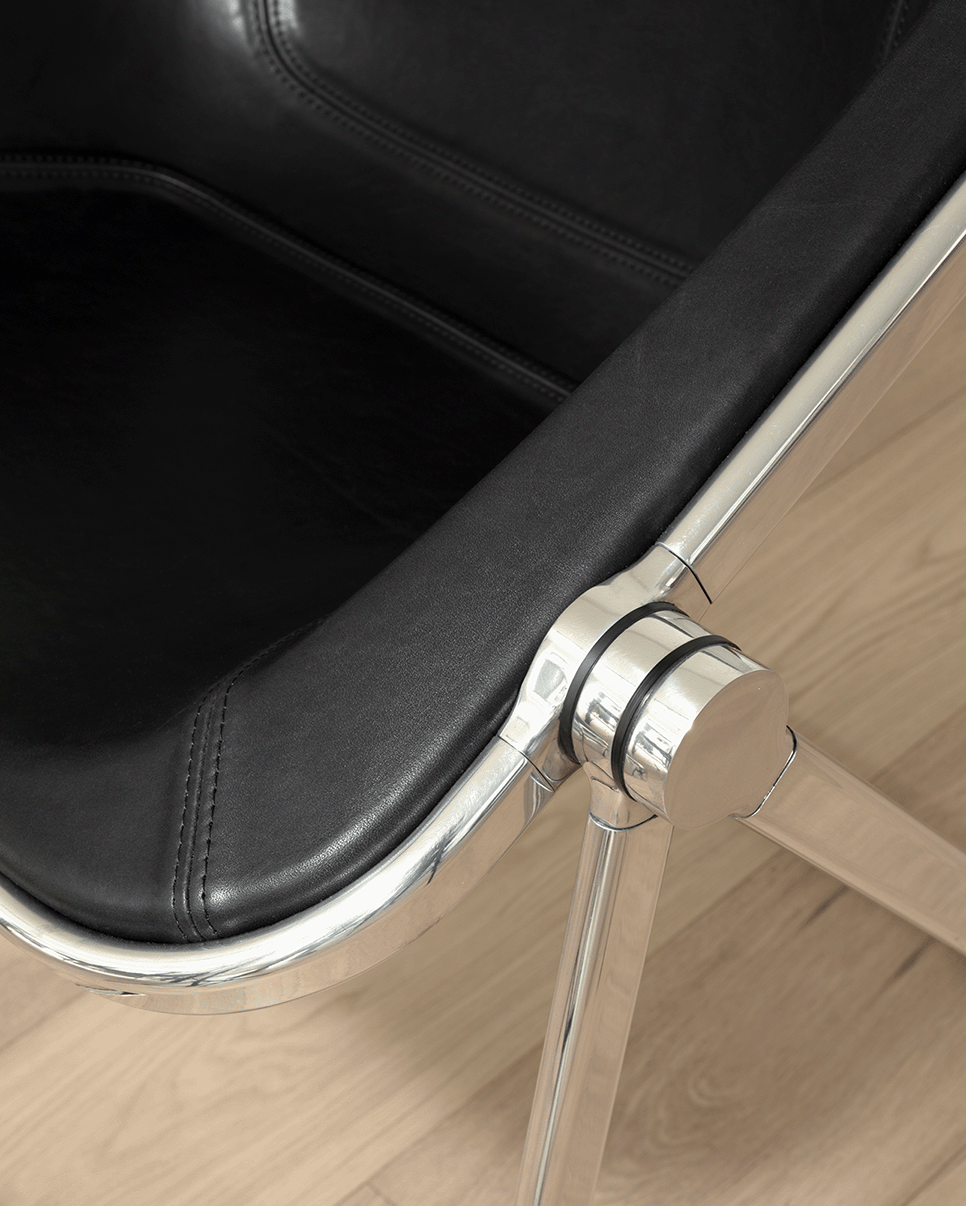 Designed in 1970 by Giancarlo Piretti, Plona is a foldable and stackable armchair using the same kind of swivel system that we see is his earlier Plia dining chair. The sturdy frame is made of stainless and polished aluminum. The Plona shell, in shockproof plexiglass, is made of a single component. This brings the user to an enveloping use.