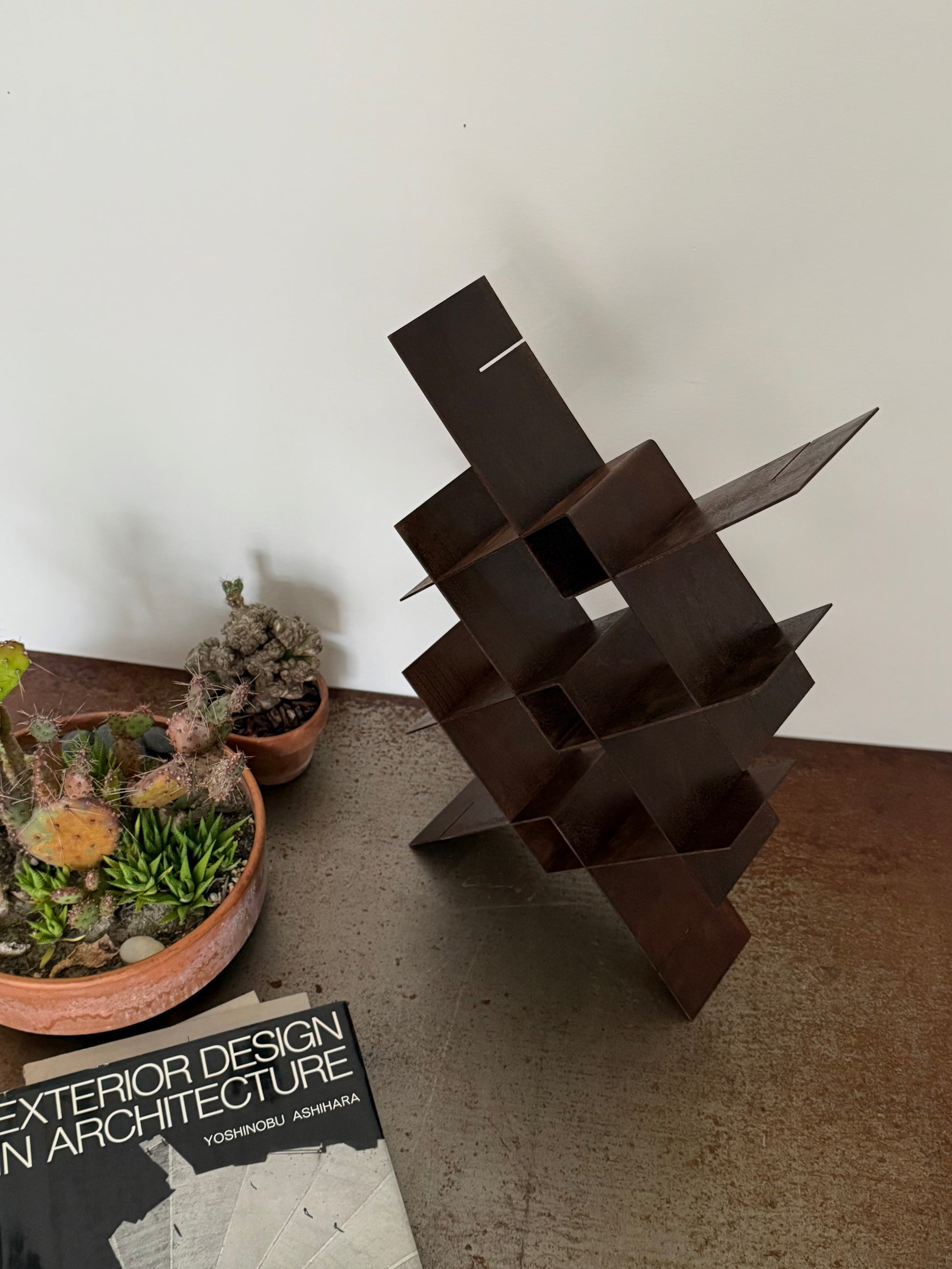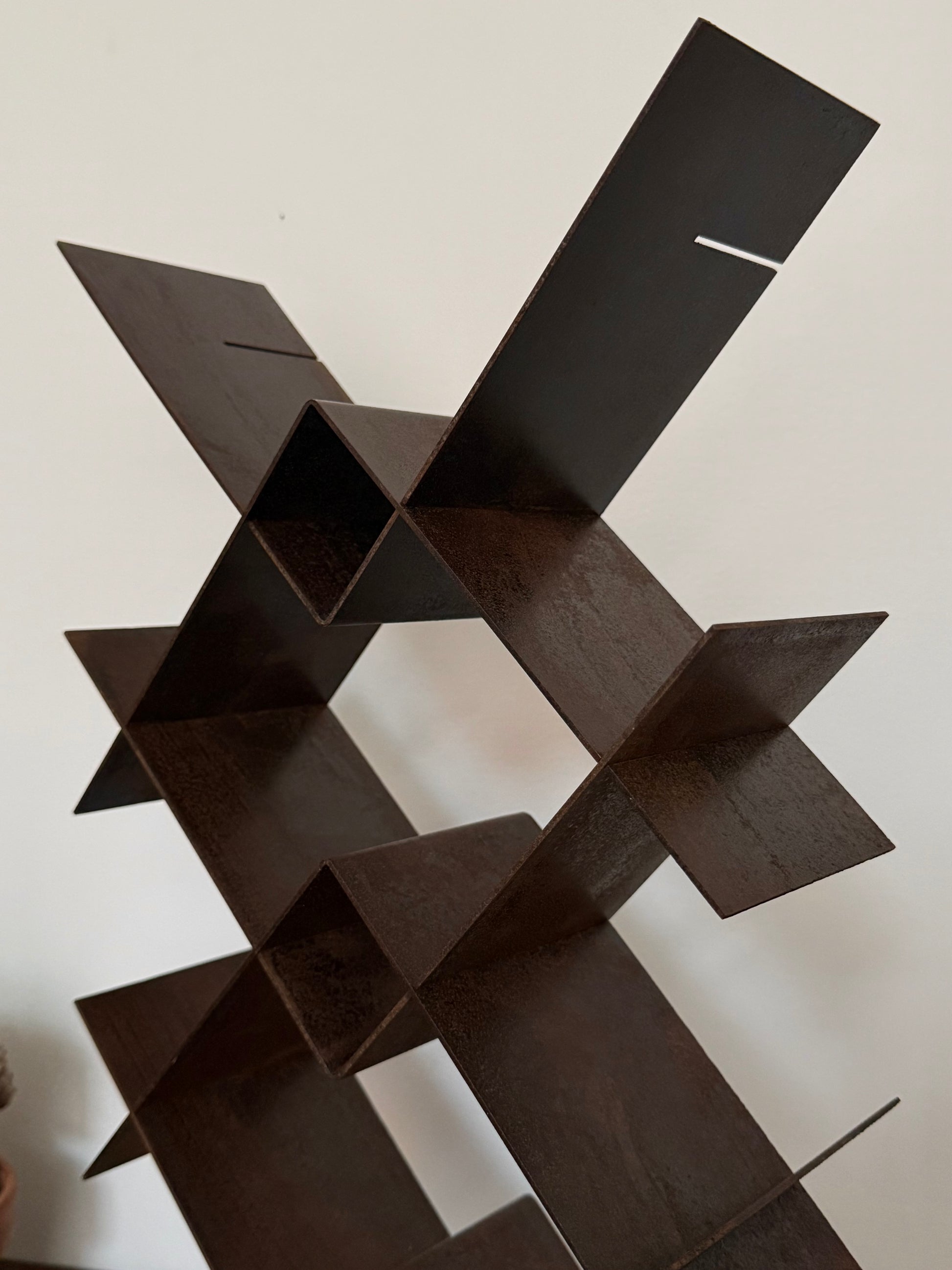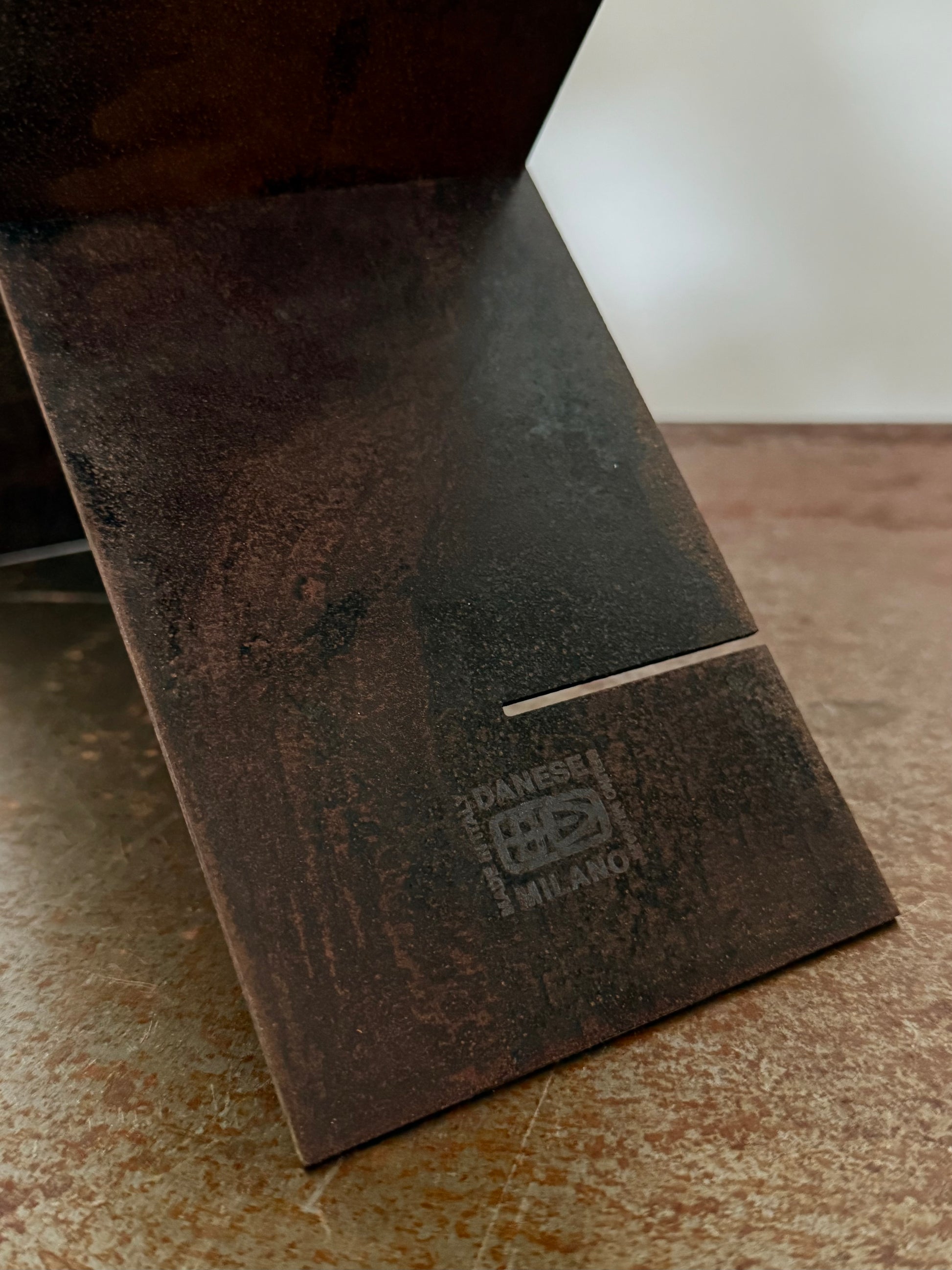 Designed in 1961 by Bruno Munari for Danese Milano and finally reintroduced in 2025, Struttura Continua is a composition of modular elements, a perfect example of an “open work” where the final shape of the object is defined only by the end user and can be modified at any time. The construction process is similar to a natural growth process, where within the same family a great variety of more or less regular final shapes can be generated. It is composed of a set of corten strips folded in the center to form a right angle. Each element then has two thin cuts that go from the center of each of the two sides of each element towards the outer edge. These slots allow you to combine the modules together by interlocking. The forms obtained are always different, since the subjectivity with which each user can create compositions involves a non-deterministic variability in the final morphology of the structure. Struttura Continua opens to a creative participation that is part of the educational path developed by the author and closely linked to the design and production of art objects accessible to all. Made in Italy, current production, on order.